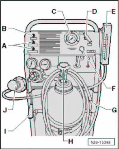 - Observe the pressure gauge - C - and flow meter - E -. The fuel system is filled if the flow quantity decreases and the pressure increases to 10 in. H2O (25 mbar).