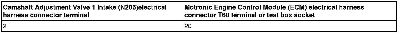 - Using a, Check the Camshaft Adjustment Valve 1 Intake (N205) or Camshaft Adjustment Valve 1 Exhaust (N318) electrical harness connector terminal 2 to the Motronic Engine Control Module (ECM) electrical harness connector for an open circuit.