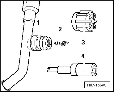 - Remove the valve insert - 2 - (2.4 ± 0.2 Nm) with the appropriate adapter - 4 - taken from the adapter set with service connections (T10364) from the valve retainer - 1 -.