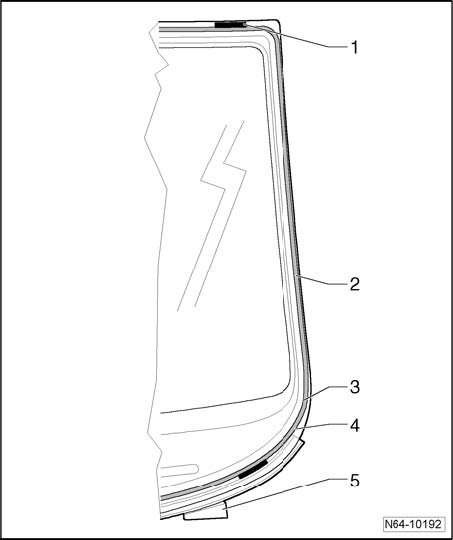 - Windshield does not have markings for the adhesive bead - 2 -. Placing of adhesive bead is between dimensions - 3 and 4 - : On top window edge, from height stop - 1 - toward inside. On side window edge, from inside edge of applied primer - 3 - toward outside. Lower window edge, from binding profile - 4 - toward inside.