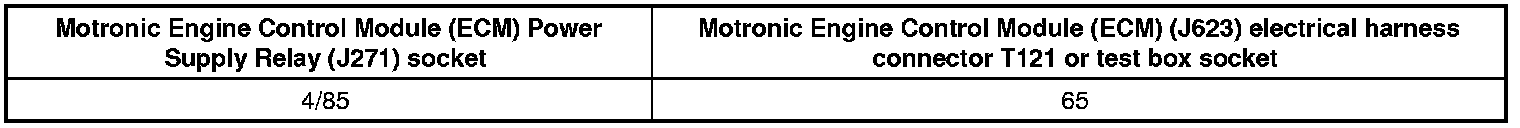 - Check the Motronic Engine Control Module (ECM) Power Supply Relay (J271) socket 4/85 to the Motronic Engine Control Module (ECM) (J623) electrical harness connector T121 terminal 65 for an open circuit or a short to Battery (+).