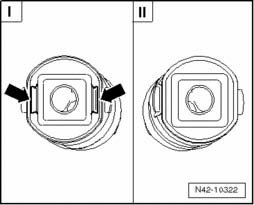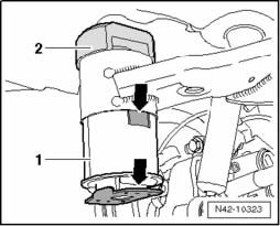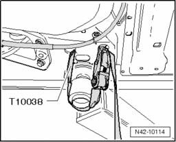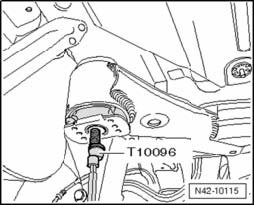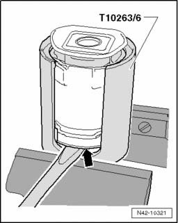 - Pry a screwdriver between the tube T10356/6 and the rubber bonded bushing -arrow- and, if necessary, remove the bushing by tapping lightly with a hammer on the drift.