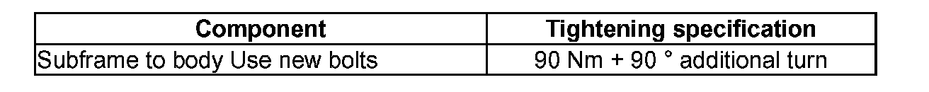 - Secure position of the subframe using 2 locating fixtures T10096 to 20 Nm.