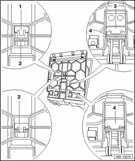 - Close cupholder, engaging mounts - 1 - and - 3 - automatically with corresponding pins - 2 - and - 4 -.