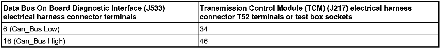 - Using a Multimeter, check the Data Bus On Board Diagnostic Interface (J533) electrical harness connector to the Transmission Control Module (TCM) (J217 ) electrical harness connector T52 for resistance.