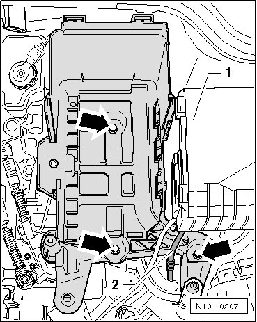 - Remove the battery tray bolts - arrows - and remove the battery holder from the vehicle.