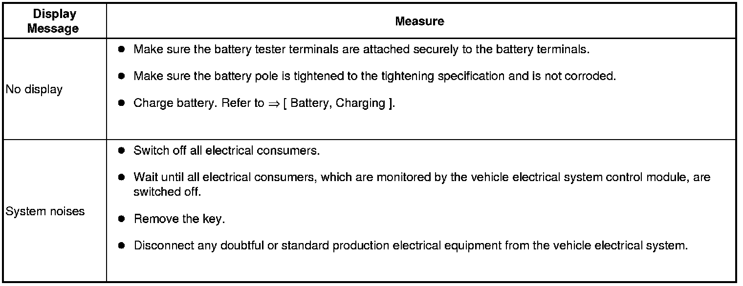 Wait a few minutes and then perform the test again. Refer to => [ Battery, Testing ]. Battery, Testing