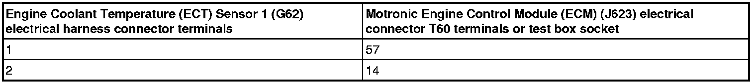 - Using a multimeter, check the Engine Coolant Temperature (ECT) Sensor (G62 or G83) electrical harness connector terminal 1 to the Motronic Engine Control Module (ECM) ( J623) electrical harness connector for an open circuit or a short to voltage, refer to the chart below for the appropriate sensor.