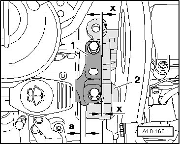 • The casting edge on the engine mount bracket - 2 - must be parallel to the engine mount - 1 -.