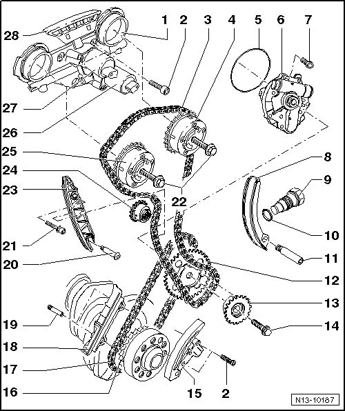 • Camshaft adjustment valve removing and installing, refer to => [ Camshaft Adjustment Valves ] Camshaft Adjustment Valves.