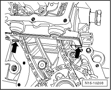 - Place a thin sealant bead - arrows - from below, in both corners between the cylinder head gasket and cylinder block so that the cylinder head gasket holes are filled.