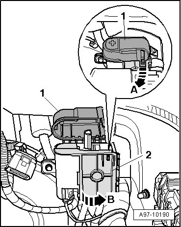 - Disengage retaining clip - arrow A - and open cover - 1 - over positive pole pick-up.