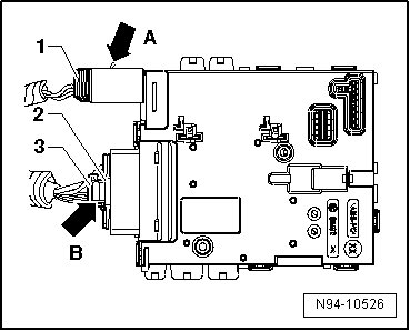 - Disengage connector - 1 - on right side of control module by pressing on the latching button - 2 - in direction of arrow and disconnect connector - 1 - from Steering Column Electronic Systems Control Module - 3 -.