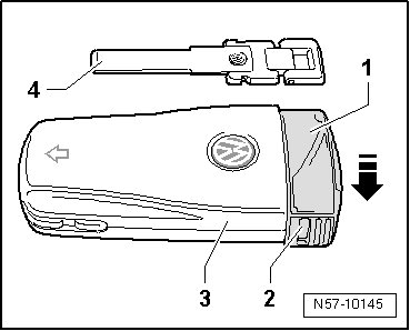 Press the side button - 2 - on the ignition key - 3 - and remove the emergency key - 4 -.