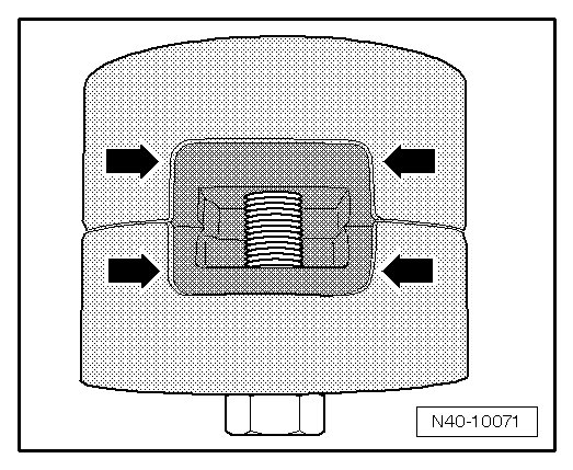 • The corners on the inner core of the bonded rubber bushing - arrows - must lie parallel with the edge of the assembly tool (T10244) - 1 -.