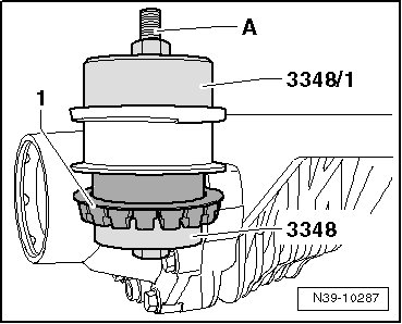 - Remove the bonded rubber bushing - 1 - using the front and rear bearing tool (3348) and a plastic mallet.
