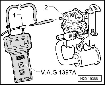 - Connect the (V.A.G 1397A) with the T-piece and 6 mm diameter hose between the vacuum line - 1 - and LDP - 2 -.