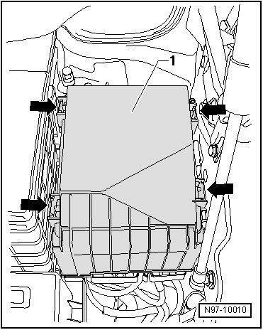 • In order to be able to remove the flat terminal housing - 1 -, air filter housing (only vehicles with Diesel engine), battery and battery console must be removed.