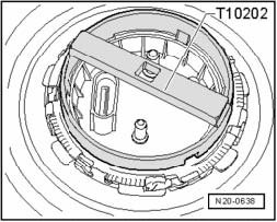 - Tighten locking ring with wrench T10202. Tightening specification: 110 Nm.