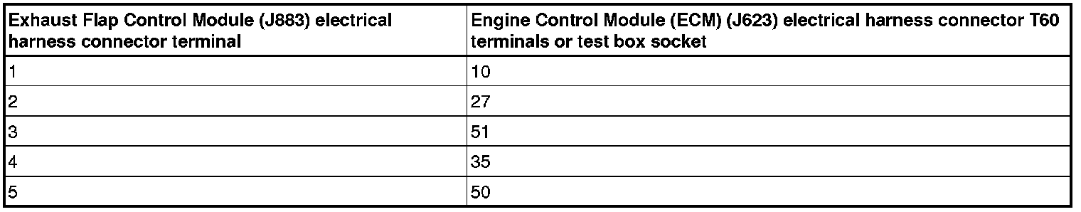 - Using a multimeter, check the Exhaust Flap Control Module (J883) electrical harness connector to the Engine Control Module (ECM) (J623) electrical harness T60 connector for resistance.