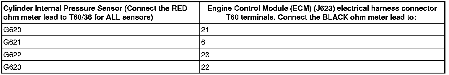 - Using a multimeter, check the following Engine Control Module (ECM) (J623) circuits for resistance with the Cylinder Internal Pressure Sensor (glow plug) connected. Connect the RED ohm meter lead to T60/36. Connect the BLACK ohm meter lead to the corresponding sensor terminal listed in the chart below.