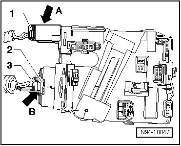 - On the steering column electronics control module, slide a wire or a 2.5 mm drill - 2 - approximately 45 mm into hole - arrow 1 -, whereby the retaining detent is released - arrow 2 -.