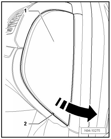 - Remove side cover - 1 - of instrument panel, do this by inserting (VAS 3409) or a screwdriver into recess - 2 - and pry off cover - 1 - in - direction of arrow -.