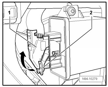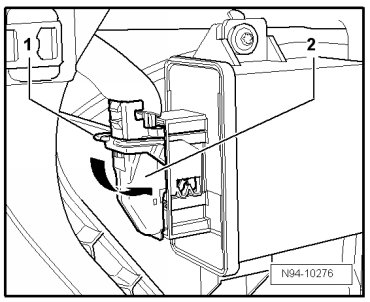 - Disengage securing bracket - 1 - in - direction of arrow - and disconnect harness connector - 2 - from Headlamp Range Control Module (J431).