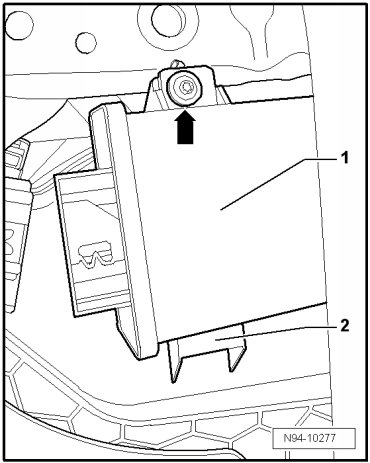 - Remove mounting bolt - arrow - and remove Headlamp Range Control Module (J431) - 1 - from bracket - 2 -.