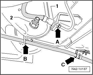 - Unclip parking brake cable from bracket at rear axle body - arrow A - and disengage from brackets - arrows -.