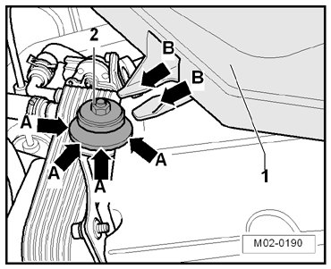 - First, pull engine cover at mounting points - arrows A - carefully out of retainer.