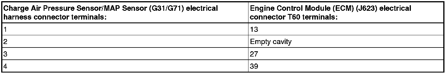 - Using a multimeter, check the Charge Air Pressure Sensor/MAP Sensor (G31/G71) electrical harness connector terminals to the Engine Control Module (ECM) (J623) electrical harness connector terminals for an open circuit according to wiring diagram.