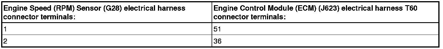 - Using a multimeter, check the Engine Speed (RPM) Sensor (G28) electrical harness connector terminals to the Engine Control Module (ECM) (J623) electrical harness connector terminals for an open circuit.