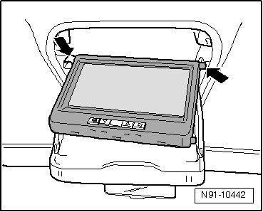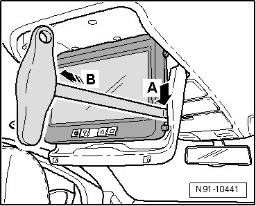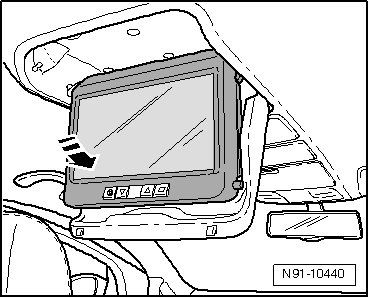 - Guide hook (VAS 3370) between monitor and cover in roof console and move it downward in - direction of arrow - until it contacts plastic monitor pins.