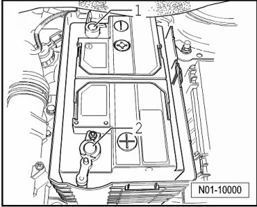- Tighten the battery clamp - 1 - on the battery negative terminal to 9 Nm.