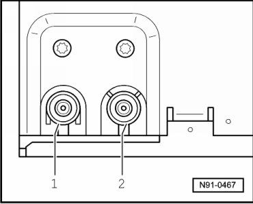 Antenna signal input via connection 1 is tested in radio navigation system and result is output to antenna selection control module via connection 2. Function is switched to another antenna when antenna signal is determined to be weak (diversity). This procedure is not audible to the customer.