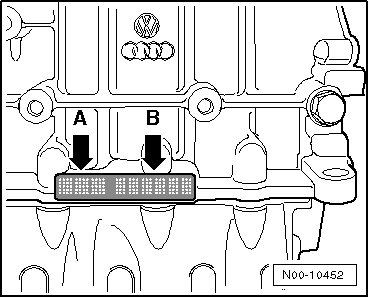 The engine code - arrow A - and engine number (serial number) - arrow B - are located on the rear side of the engine, above the partition of cylinder block/upper oil pan.