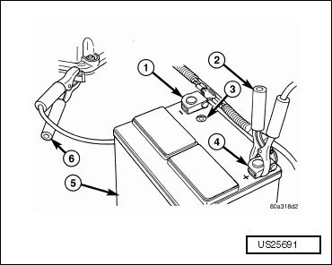 - Connect jumper cables to the booster battery. Connect the RED clamp to positive terminal (+). BLACK clamp to the negative terminal (-). DO NOT allow clamps at opposite end of cables to touch, electrical arc will result. Review all warnings in this procedure.
