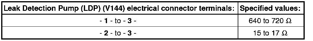 - Using a multimeter, check the Leak Detection Pump (LDP) (V144) for resistance as follows: