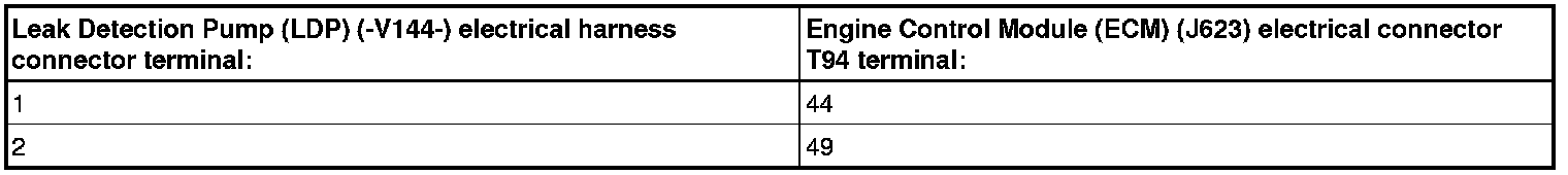 - Using a multimeter, check the Leak Detection Pump (LDP) (-V144-) electrical connector terminals to Engine Control Module (ECM) (J623) electrical connector terminals for an open circuit or high resistance.