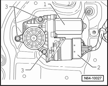 - Remove the window regulator motor with the control module - 1 - from the subframe.