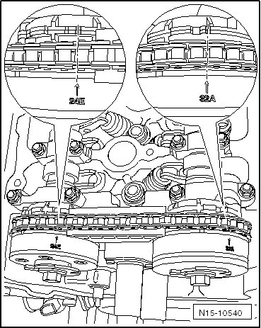 - The distance between the marks on the camshaft adjuster must be exactly 16 rollers of the timing chain.