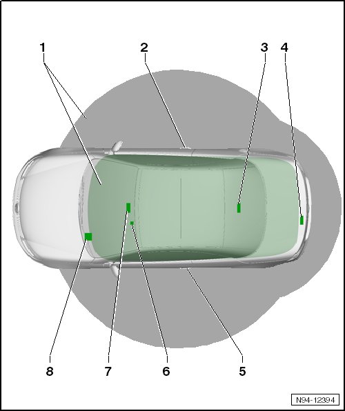 • The Access/start authorization antenna 1 in vehicle interior -R138- is located in front of the gear lever, under the front