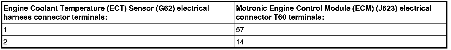 - Using a multimeter, check the the Engine Coolant Temperature (ECT) Sensor (G62 or 83) electrical harness connector terminals to the Motronic Engine Control Module (ECM) (J623) electrical harness connector T60 terminals for an open circuit or a short to voltage, refer to the chart below.