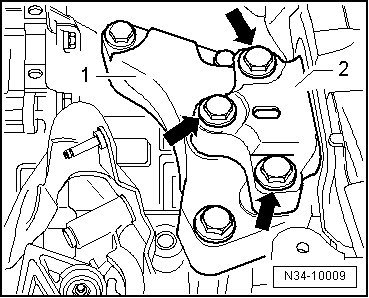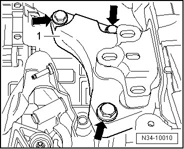 Tighten the transmission mount bracket - 1 - to transmission bolts - arrows - to 60 Nm + 90° (1/4) additional turn.