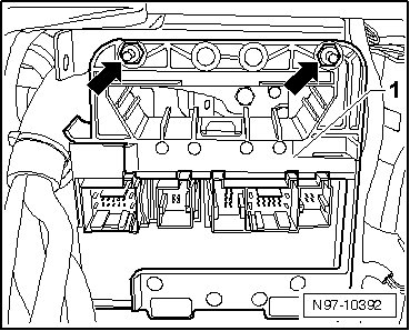 - Pull retaining tab - 2 - on the comfort system central control module bracket in the - direction of the arrow - and slide the comfort system central control module until recesses - 1 - and - 3 - line up.
