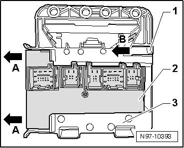 - Pull retaining tab - 1 - in - direction of arrow B - and slide comfort system central control module - 2 - out of bracket - 3 - in - direction of arrow A -.