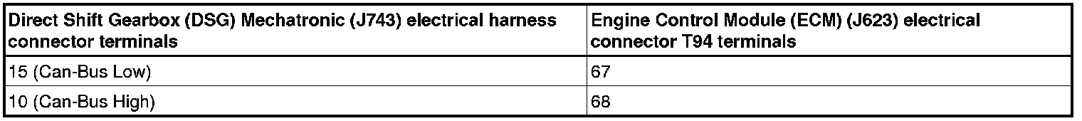 - Using a multimeter, check the Direct Shift Gearbox (DSG) Mechatronic (J743) electrical harness connector to the Engine Control Module (ECM) (J623) electrical harness connector T94 for resistance.