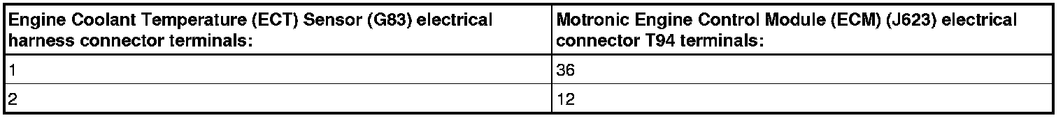 - Using a multimeter, check the the Engine Coolant Temperature (ECT) Sensor (G62 or 83) electrical harness connector terminals to the Motronic Engine Control Module (ECM) (J623) electrical harness connector T60 terminals for an open circuit or a short to voltage, refer to the chart below.