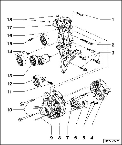 • Generator ribbed belt pulley, removing and installing, refer to => [ Ribbed Belt Pulley Without Freewheel ] Ribbed Belt Pulley Without Freewheel, => [ Ribbed Belt Pulley with Freewheel, Bosch ] Ribbed Belt Pulley With Freewheel, Bosch or => [ Ribbed Belt Pulley with Freewheel, Valeo ] Ribbed Belt Pulley With Freewheel, Valeo.